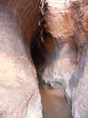 Continue down Harris Wash, opting to walk along the adjacent benches wherever possible to stay out of the deep sand in the wash. After walking a little over a mile from the mouth of Zebra Canyon you will see a north trending side canyon opening on your left. Turn left (north) and travel up the side canyon for 0.2 miles to Tunnel Slot. The “tunnel” slot is over 200-ft. long and is usually filled with water. Depending on the temperate and the time of year a wade through the tunnel may be a welcome relief from the hot sun.